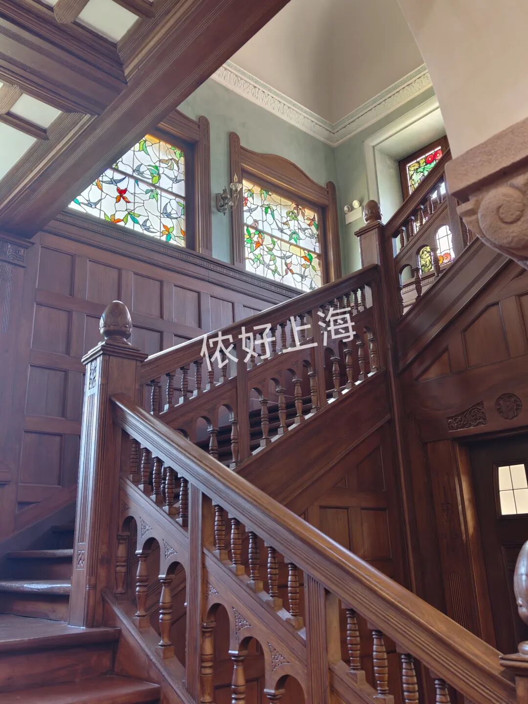 在通往二楼的楼梯旁